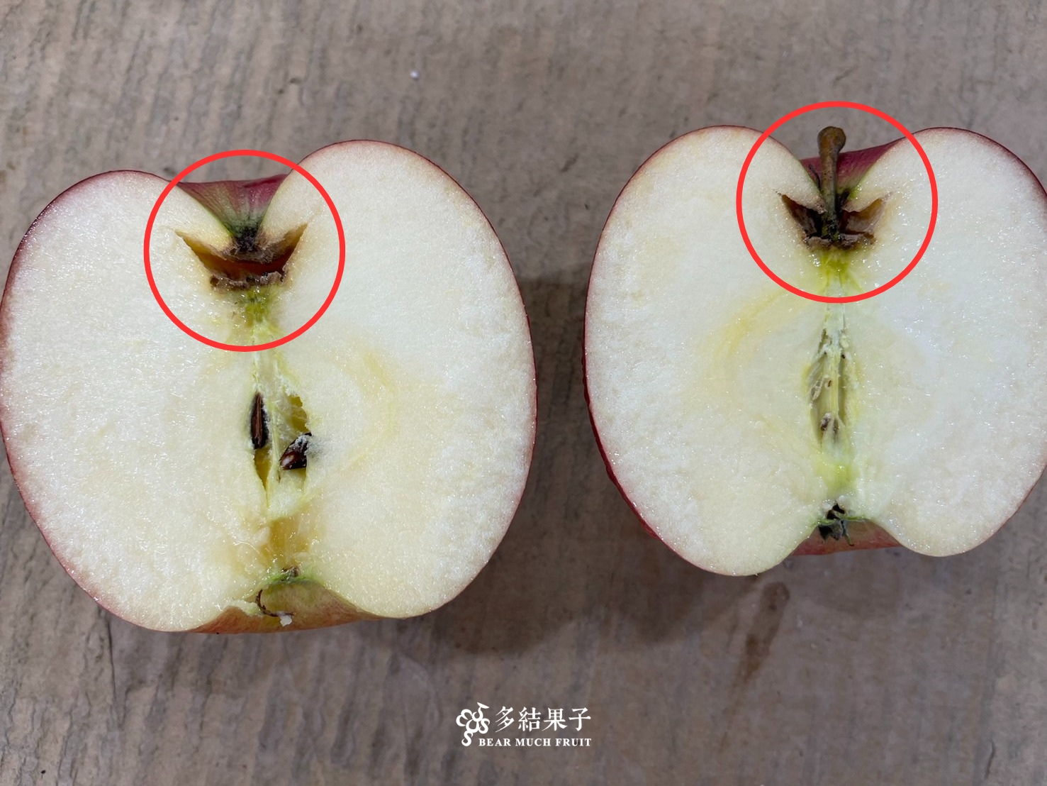 近幾年常發現,蘋果偶爾會有出現開口(圖中紅色圓圈處)